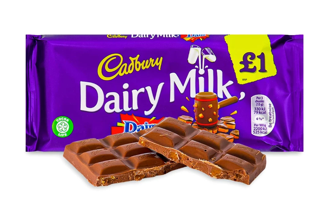 Dairy Milk Daim Chocolate Bars are made with Cadbury’s creamy milk chocolate and crunchy almond caramel pieces!