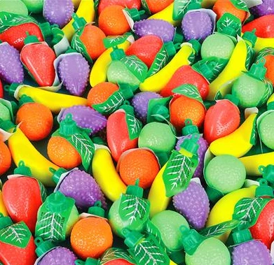 Kids love fruit when it tastes like candy. This assortment features a variety of plastic fruit shapes filled with sweet powdered candy. One dozen per bag.