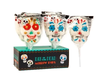 Designed to resemble sugar skulls to celebrate Dia de los Muertos, or day of the dead, soft, sweet mallow pops are a hit for the fall season. Individually wrapped mallow pops have fans in every age group. Some even say these sugar skull marshmallow pops are too pretty to eat.