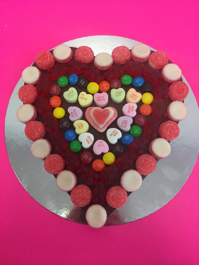 This beautiful single layer chocolate heart takes the boring out of the traditional chocolate gift. Amazing tasting chocolate topped with a variety of candy, chocolate and gummies. Great for gifts or parties or just to snack on all by yourself.