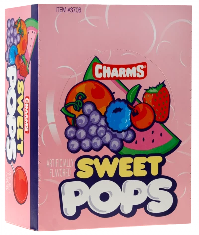 Charms Flat Pops have been one of the world’s most popular, traditional, flat lollipops. Available in a variety of tasty fruit flavours, Cherry, Strawberry, Blue Razz, Watermelon, Orange, Grape