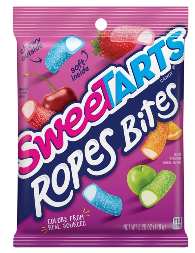 The ropes you’ve come to love are now bite-sized! SweeTARTS Ropes Bites are soft and chewy delicious with a fruit-punch filling. Bite-sized nuggets feature a sour chewy outside with a sweet, soft inside that includes flavours of Orange, Strawberry, Green Apple, Cherry, and Blue Punch. Willy Wonka would be proud!