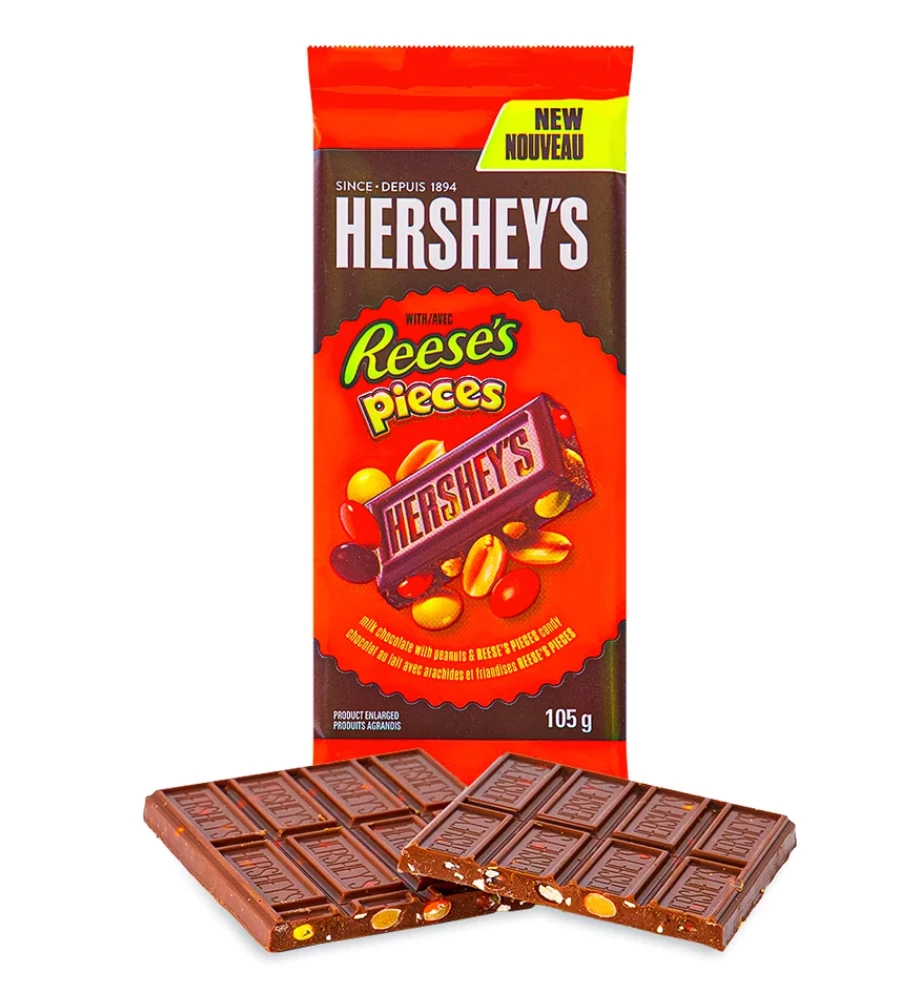 New 2 in 1 bar! Two iconic brands of HERSHEY’S and REESE’S PIECES in one bar delivering a smooth & crunchy experience! Your favourite HERSHEY’S Milk Chocolate stuffed with Mini REESE’S PIECES candy and chopped peanuts!