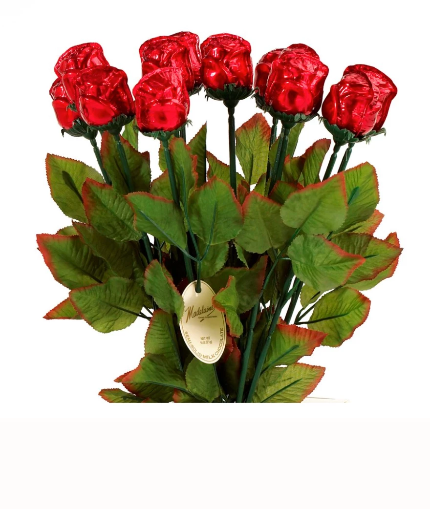 Semi-solid 19″ premium milk chocolate rose wrapped in shaded red Italian foil, nestled in a graceful long stem with silk leaves.