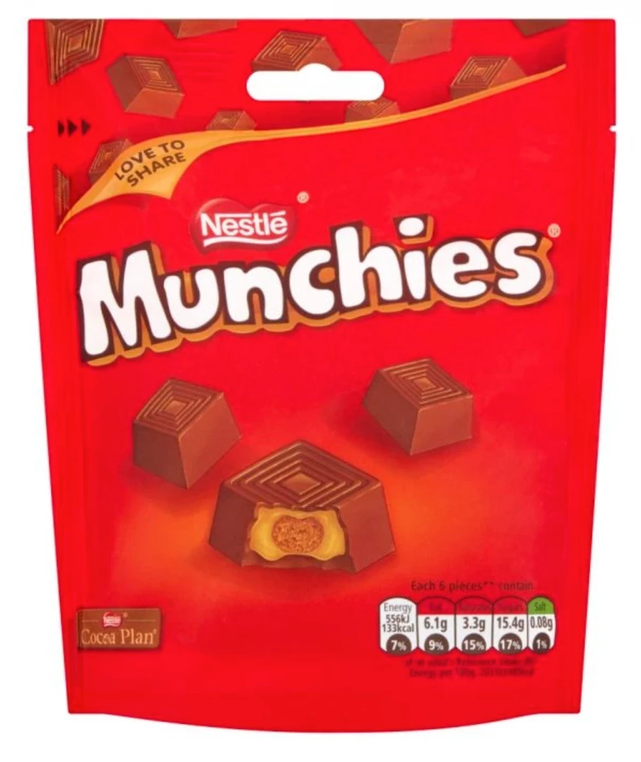 Nestle Munchies a delectable milk chocolate with a soft caramel filling and a crisp biscuit centre.