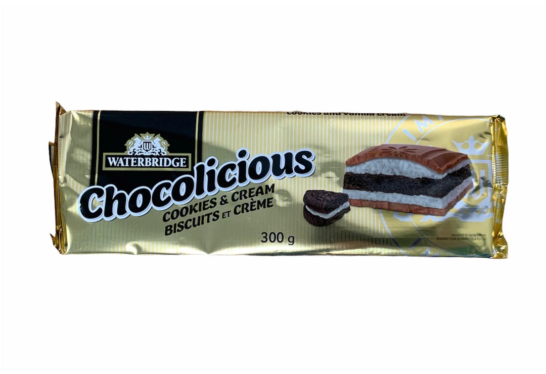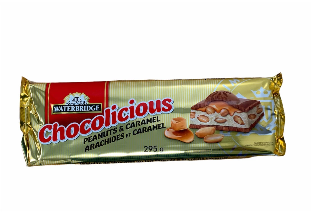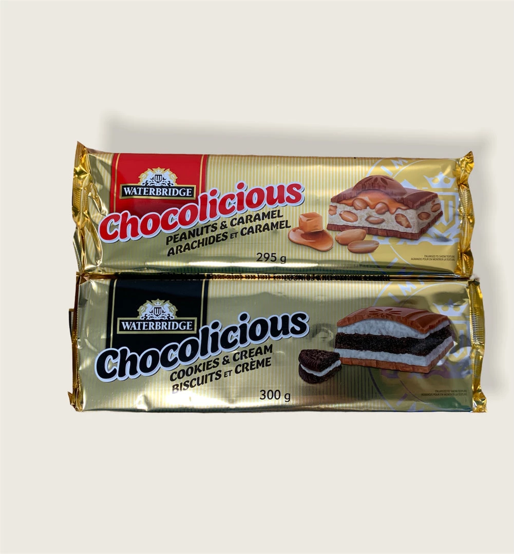Waterbridge fine chocolates. Great taste at an unbeatable price. Available in 2 flavours, Peanuts & Caramel 295gr resealable bag and Cookies ‘n Cream 300gr resealable bag.