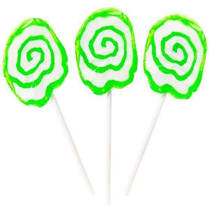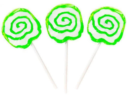 Bag contains 100 individually wrapped Petite Hypno Pops Green & White Swirled Lollipops.