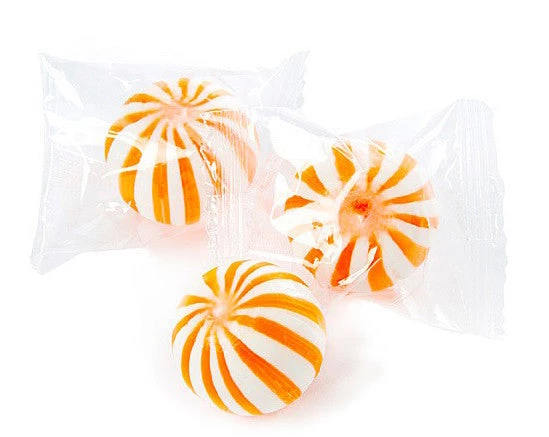 Expertly curving outward from swirly points on either side, lines that wrap across each individually wrapped orange Sassy Sphere make these delightful sweets look like striped balloons inflated to full capacity like the ones you see at the circus and county fair. Plucky and adorable, these vibrant orange and white confections taste just as good as they look. Bulbous and bright, each ball is full of fruity orange flavor that promises to perk up your taste buds and refresh your palate. Fill up a candy bowl with these jolly spheres for weddings, holidays, or any occasion, and prepare to impress your guests!