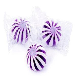 Expertly curving outward from swirly points on either side, lines that wrap across each individually wrapped purple Sassy Sphere make these delightful sweets look like striped balloons inflated to full capacity like the ones you see at the circus and county fair. Plucky and adorable, these vibrant purple and white confections taste just as good as they look. Bulbous and bright, each ball is full of fruity grape flavor that promises to perk up your taste buds and refresh your palate. Fill up a candy bowl with these jolly spheres for weddings, holidays, or any occasion, and prepare to impress your guests!