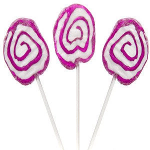 Bag contains 100 individually wrapped Petite Hypno Pops Purple & White Swirled Lollipops.