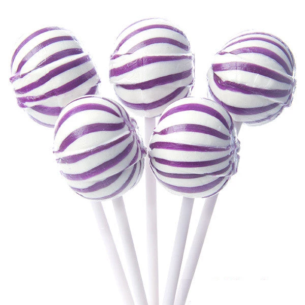 Bag contains 100 Purple Sassy Suckers Striped Ball Lollipops.