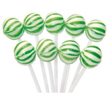 Bag contains 300 Green Sassy Suckers Petite Striped Ball Lollipops.